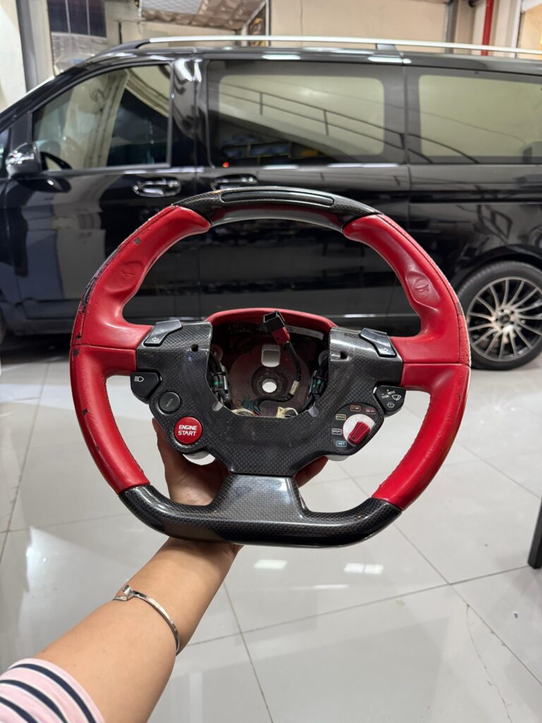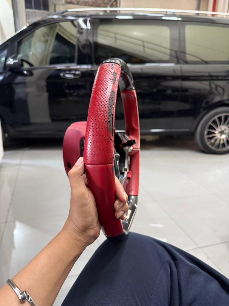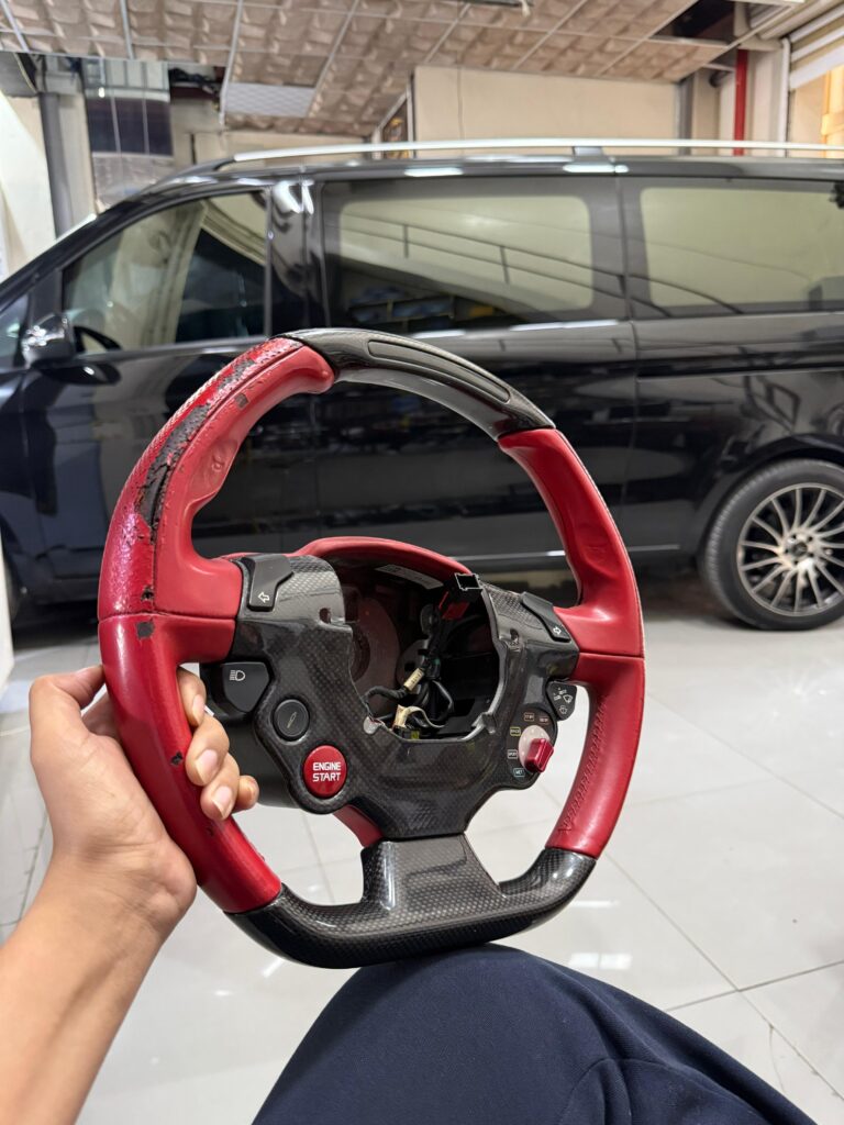 Under the leadership of Ms. Zainab, who is well-known among our clients for her sharp eye for details, our upholstery and restoration team handled the project with precision. Thanks to her supervision, the steering wheel was fully repaired, reupholstered, and refinished to look and feel just like the first day it left Ferrari’s factory.